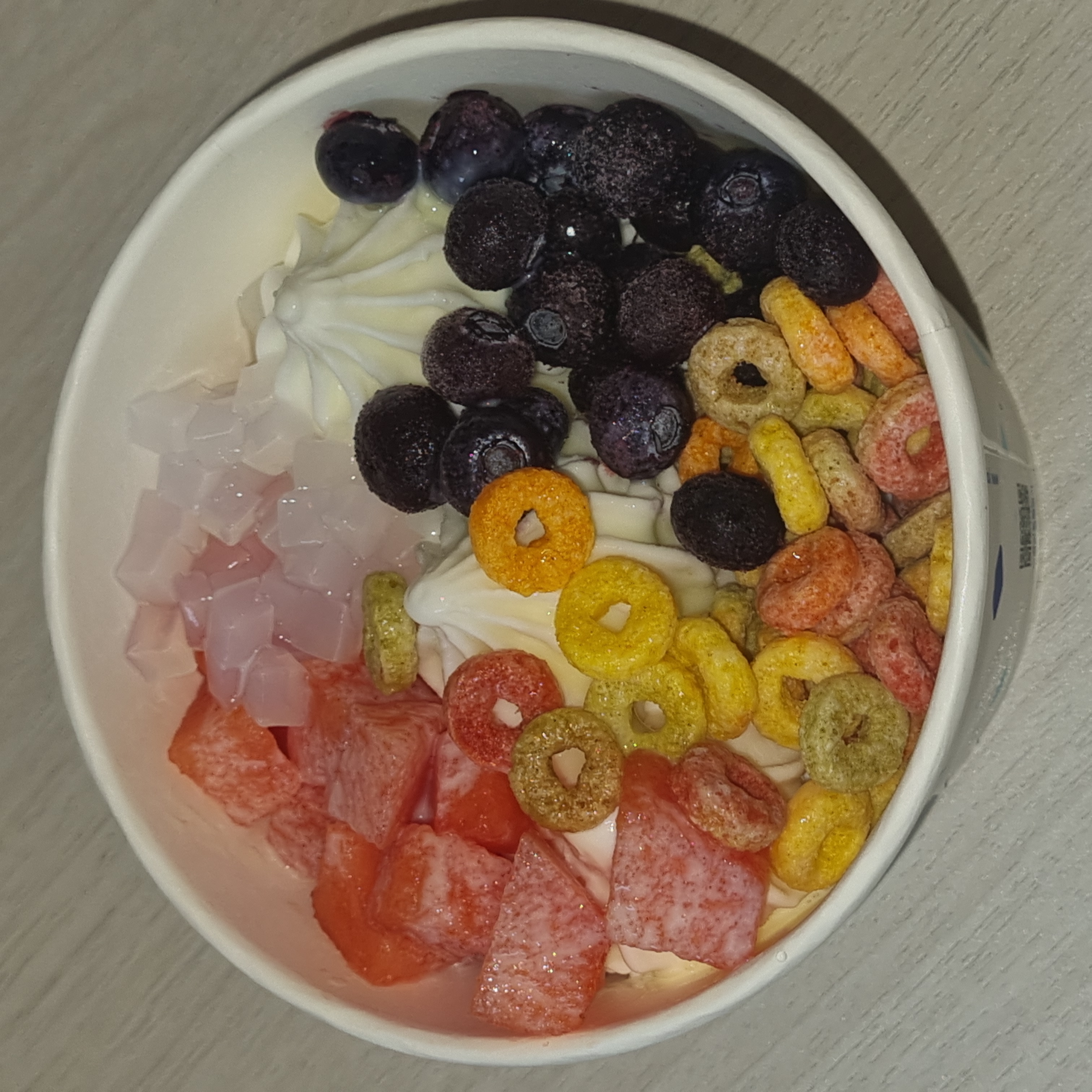 블루베리랑 코코넛 젤리가 식감을 살려줘서, 심심하지 않게 계속 떠먹게 됩니다. 후르트링은 고소하면서도 귀여운 토핑 역할을 해주는데, 누구나 다 좋아할 맛이에요