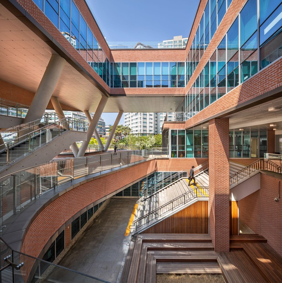 외피를 감싸는 붉은 벽돌은 구미 공공건축의 전통을 잇는 동시에 ‘가볍고 산뜻한’ 톤으로 재해석됐죠. 박스형 외관 같지만 중간중간 비워져 있어 상·하·좌·우로 시각이 뚫려 있어요. 그래서 내부와 외부가 소통하고, 서로 마주 앉는 ‘대화형 공간’이 탄생합니다